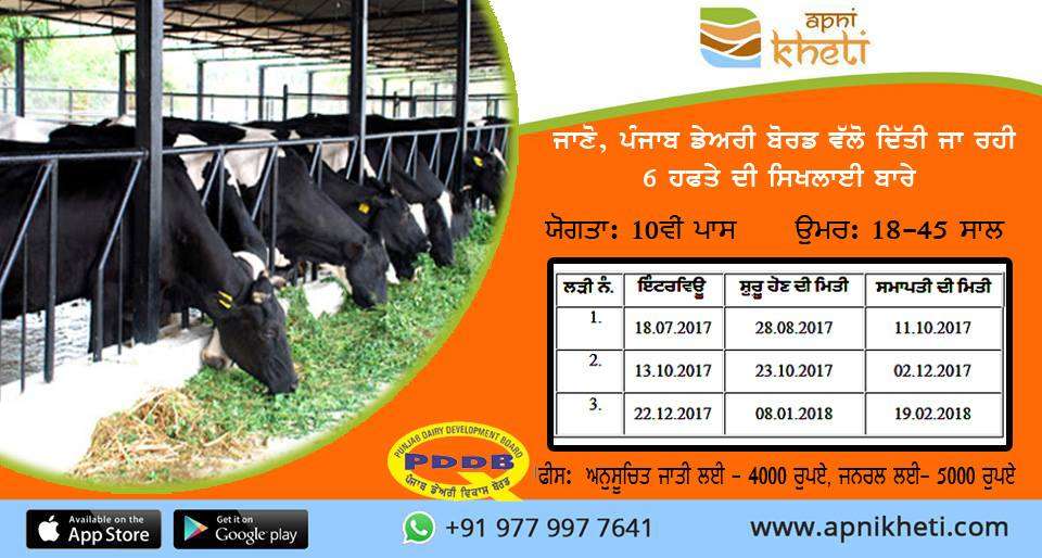 ਡੇਅਰੀ ਫਾਰਮਿੰਗ ਦੇ ਕੰਮ ਵਿੱਚ ਨਿਪੁੰਨ ਅਤੇ ਸਵੈ-ਨਿਰਭਰ ਬਣਾਉਣ ਲਈ ਪੰਜਾਬ ਡੇਅਰੀ ਵਿਕਾਸ ਬੋਰਡ ਵੱਲੋਂ ਡੇਅਰੀ ਉੱਦਮ ਸਿਖਲਾਈ ਮੁਹੱਈਆ ਕਰਵਾਈ ਜਾ ਰਹੀ ਹੈ, ਜਿਸਦਾ ਅਗਲਾ ਬੈਚ 28 ਅਗਸਤ 2017 ਤੋਂ ਹੇਠ ਲਿਖੇ ਸਿਖਲਾਈ ਕੇਂਦਰਾਂ ਵਿੱਚ ਸ਼ੁਰੂ ਹੋ ਰਿਹਾ ਹੈ ।